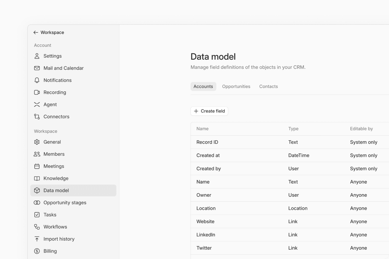 Lightfield starts at $59/user/month, with discounts for annual contracts. It includes a meeting recorder, AI agent, email sync, workflow automation, and every AI feature. No hubs, no tiers, no add-on fees.