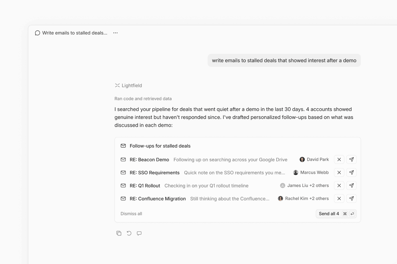 Every call, email, and meeting — logged automatically. Contacts created. Deal stages updated. Notes written. Not because someone remembered to do it after the call, but because Lightfield was listening. Connect your email and calendar. Everything after that is automatic.