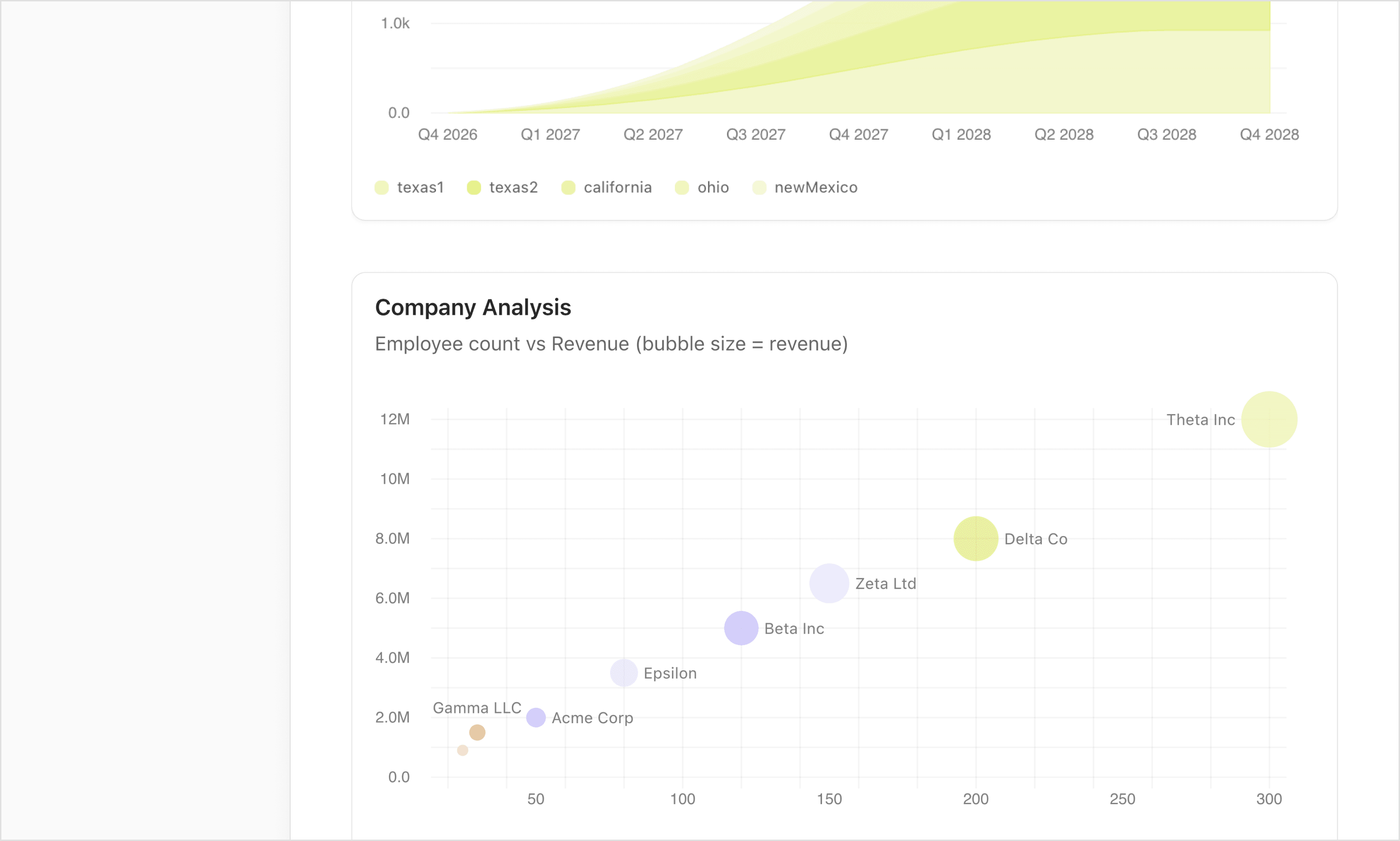 We’ve added more expressive and flexible data visualization tools for generated reports. Some new capabilities to try: area, stacked area, scatter, radar, gauge, heatmap.