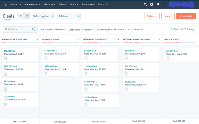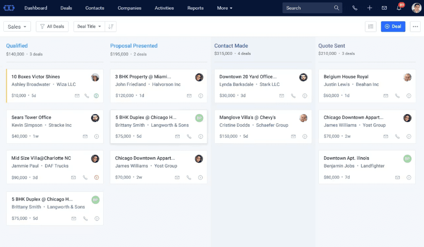 - Visual sales pipeline to track deal stages and progress