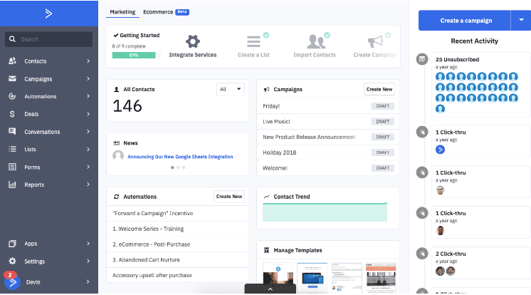 - More focused on email marketing than traditional CRM functions