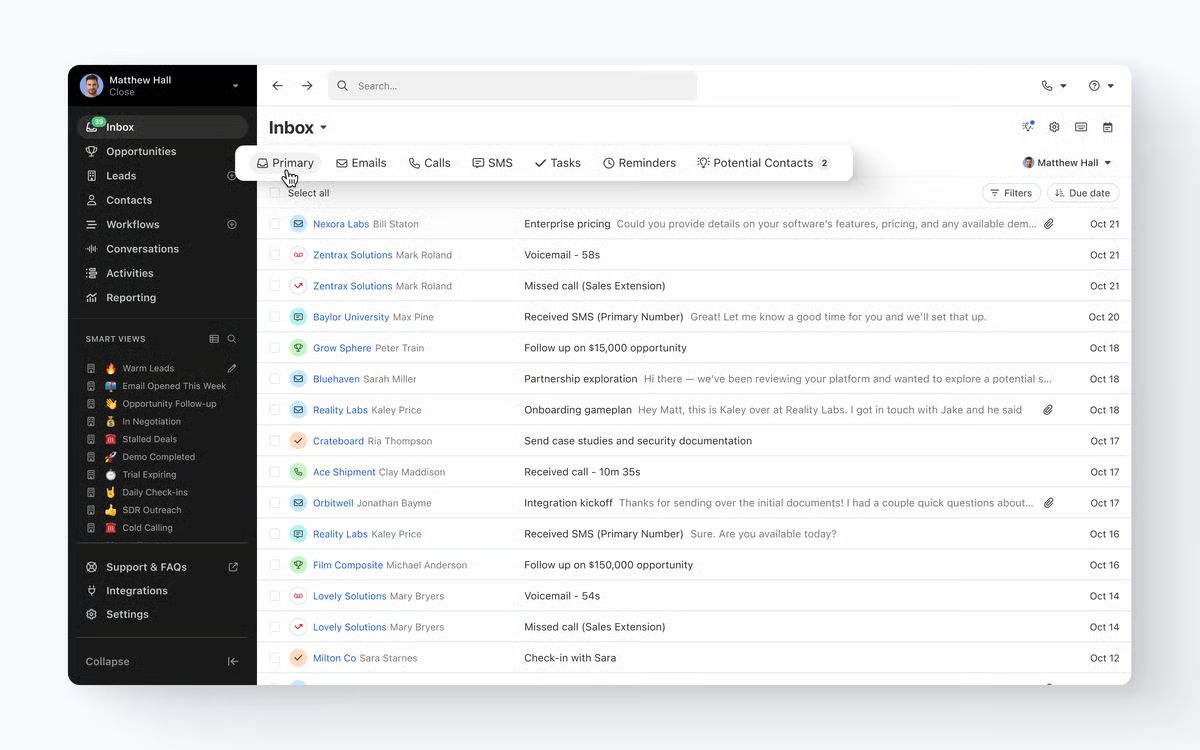 Close positions itself as an all-in-one sales workspace where conversations, calls, emails, SMS, tasks, and reporting live in one platform. Built primarily for outbound teams that prioritize high-velocity communication and centralized activity tracking, it was originally developed as an internal tool at a Y Combinator-backed company and has since grown into one of the more recognized names in inside sales CRM.