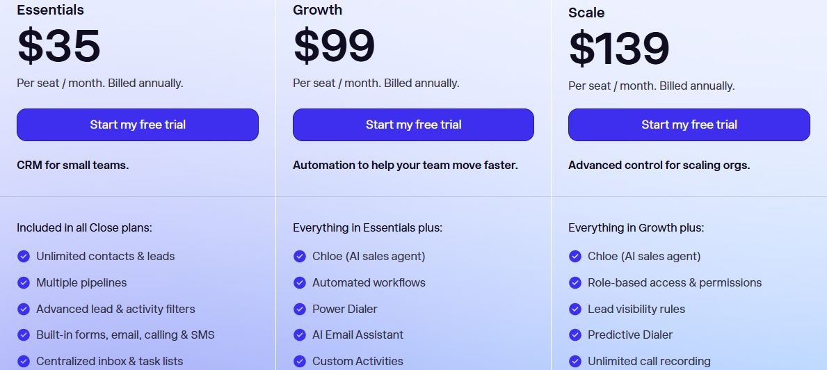 - Pricing structure: The features that justify Close's price—automation, Power Dialer, AI tools—require the Growth plan at $99/user/month. Call transcription costs extra on top of that. Smaller teams can hit meaningful costs before accessing what makes Close competitive.