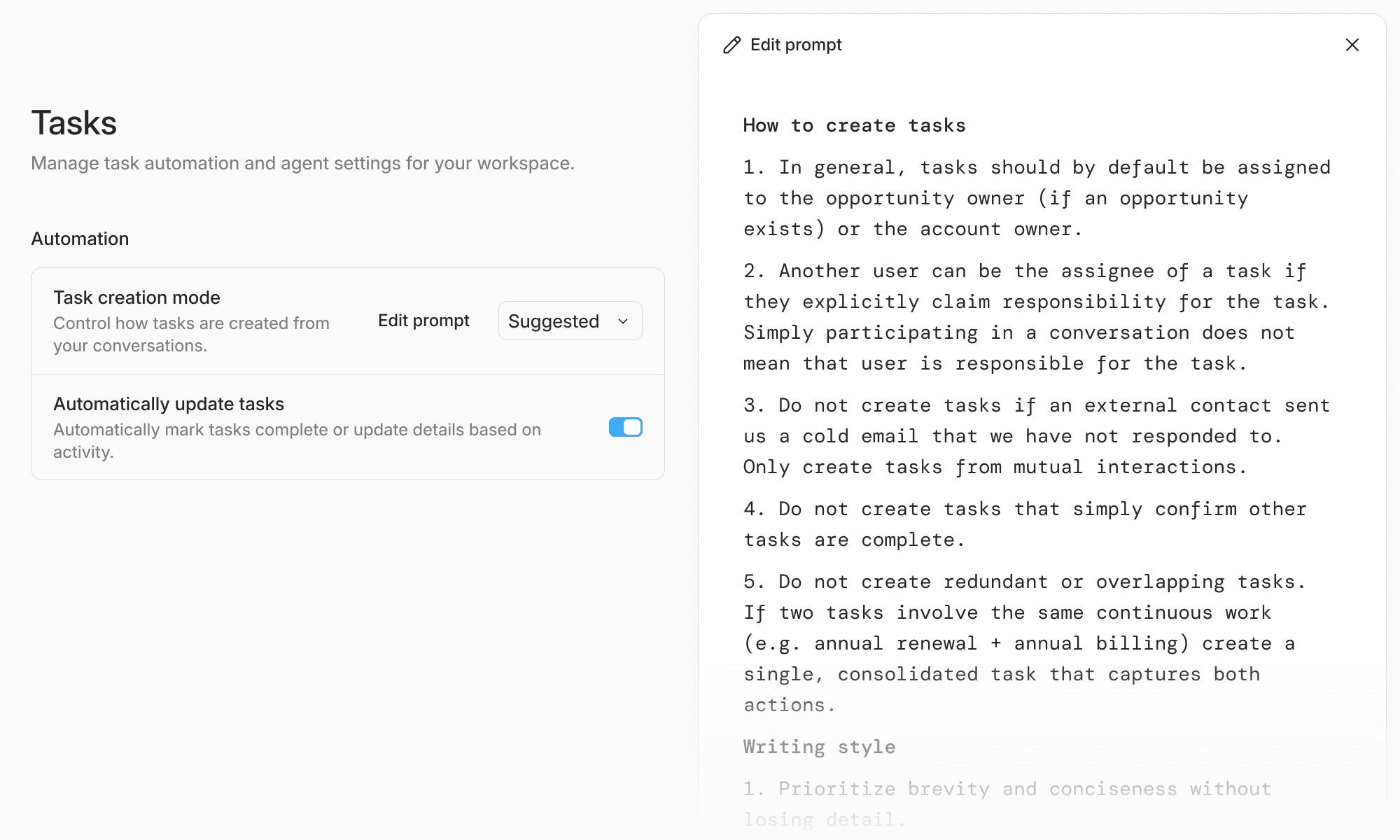 Instructions for how tasks are created are now exposed and editable. You can allow Lightfield to automatically create and manage tasks using these instructions.