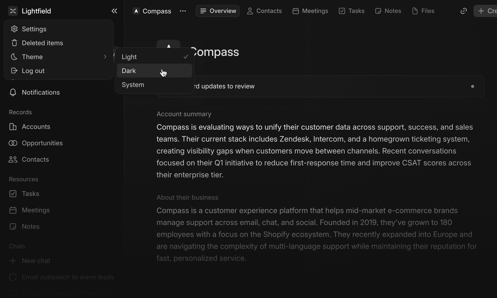 Lightfield now has a dark theme — so you can use your CRM at night.