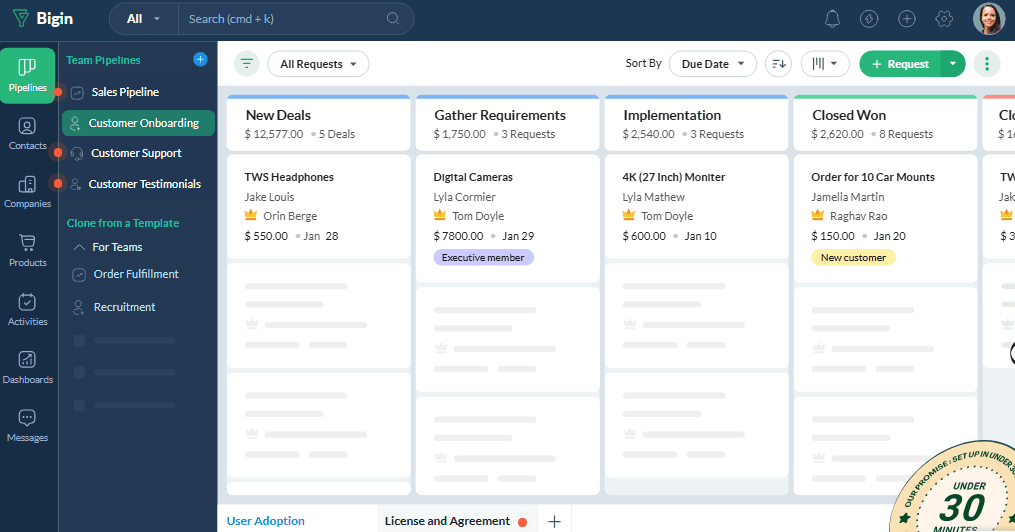 A CRM built for sales teams, combining automated communications, pipeline management, and reporting to optimize workflows.