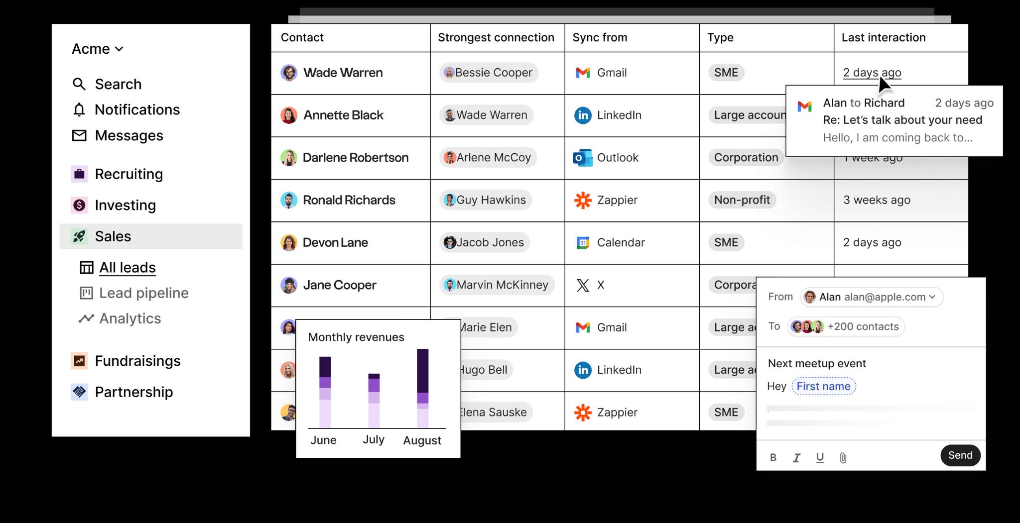 - AI surfaces relationship gaps and dormant contacts before they go cold