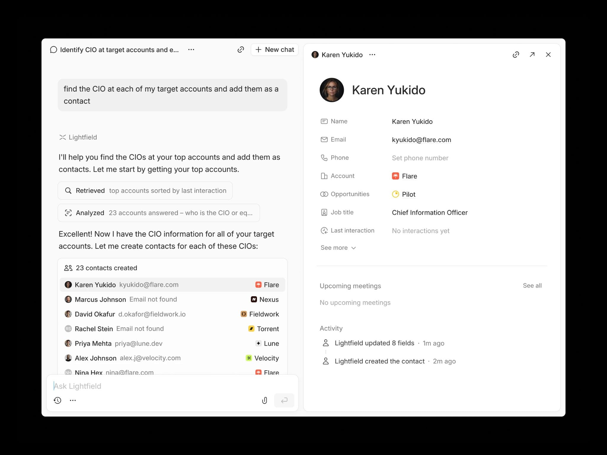 Folk captures contacts fast but not what was said. HubSpot logs emails and calendar events but not call context, promises, or next steps. Lightfield records every email, call, and meeting and turns that into structured data without manual input.