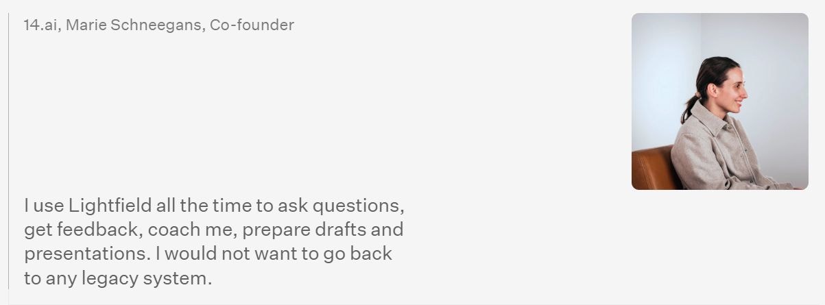 - Retroactive custom fields: add a field today, Lightfield backfills it from past conversations
