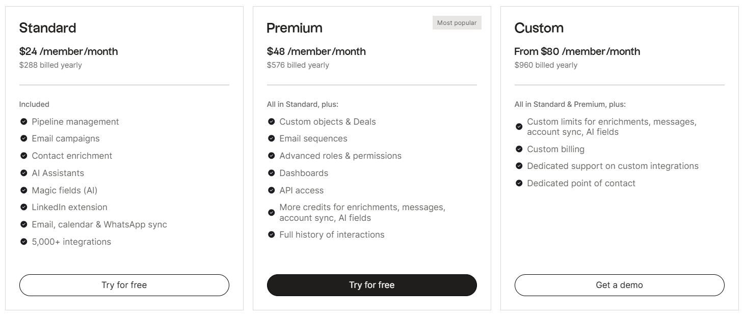 Folk's entry price is low at $24/user/month annual on Standard. But feature gaps push most sales teams to Premium ($48/user/month) within weeks. A 5-person team on Premium pays just over $200/month. Enrichment credits are workspace-wide — 500 on Standard, 1,000 on Premium — limiting outbound volume.