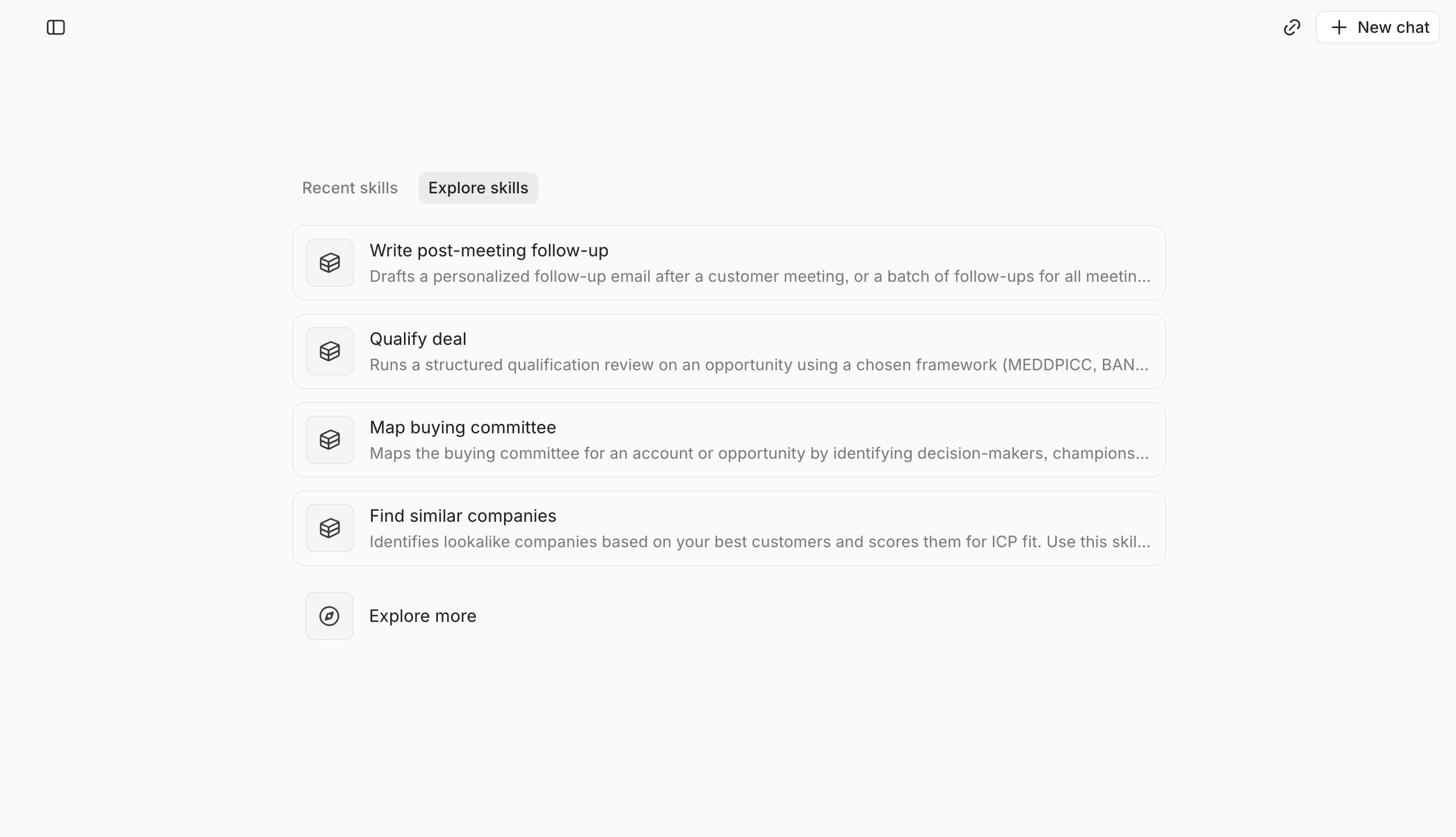 - Start with one pre-built Skill. Discovery prep or post-meeting follow-up are great starting points. Pick whichever matches the workflow you repeat most often.