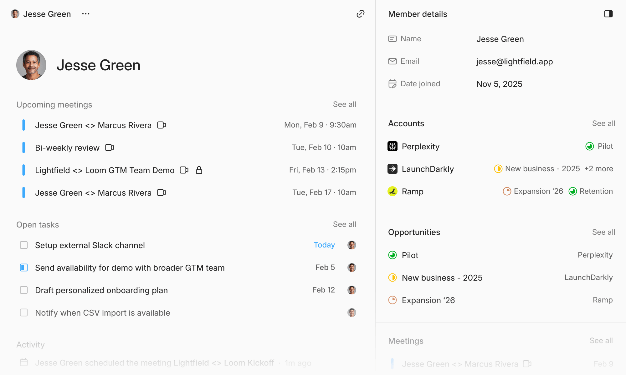 New member profile pages now display accounts, opportunities, meetings, tasks, and activity timeline in one place. Member names throughout the app now link to their profile pages.