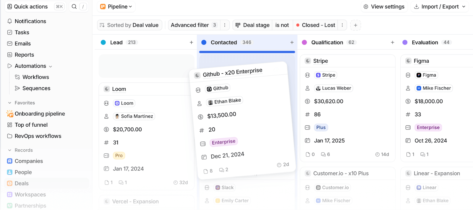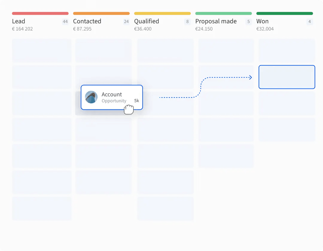 - Drag-and-drop pipeline view with deal stages