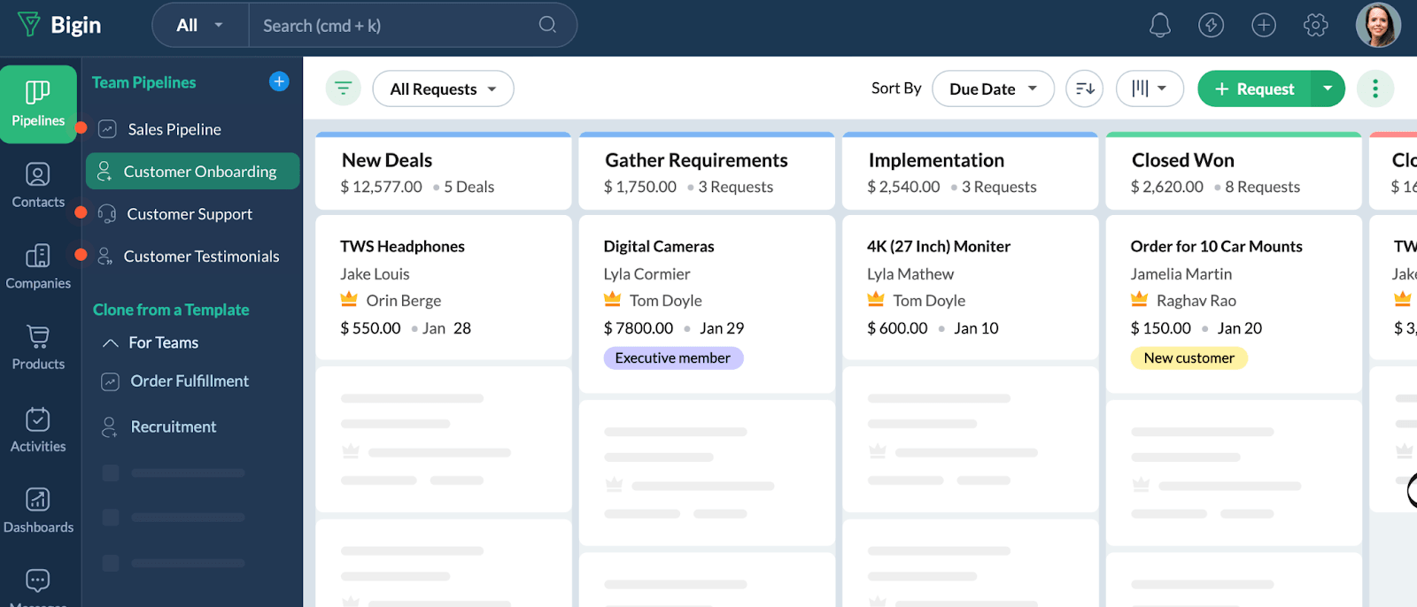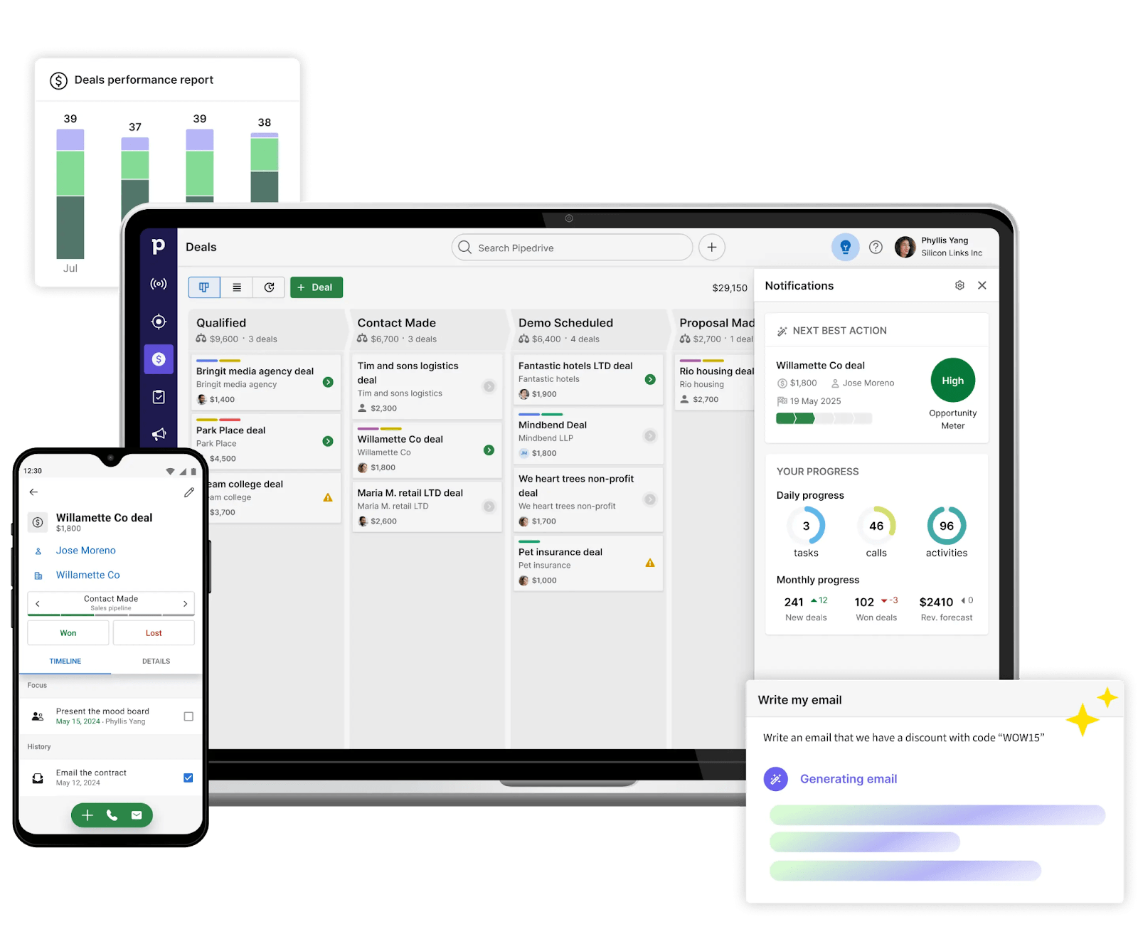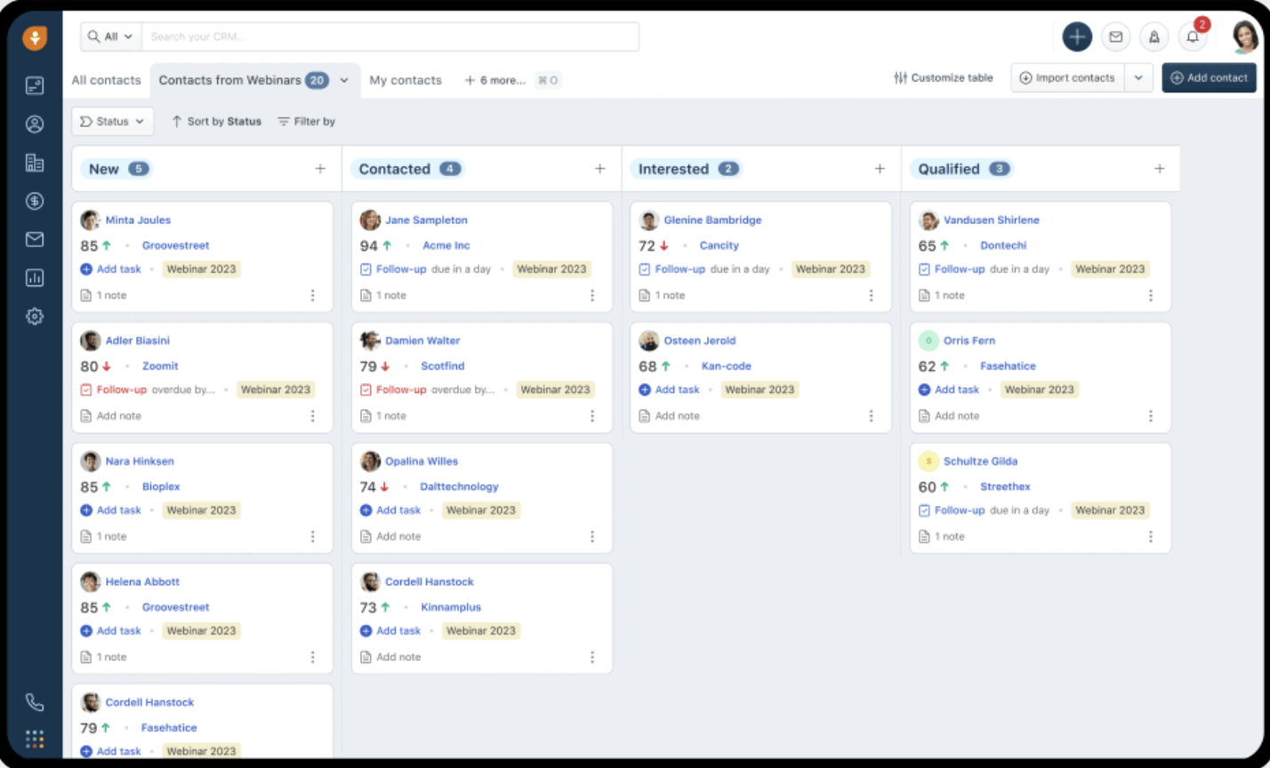 - Visual pipelines with reminders and deal health indicators