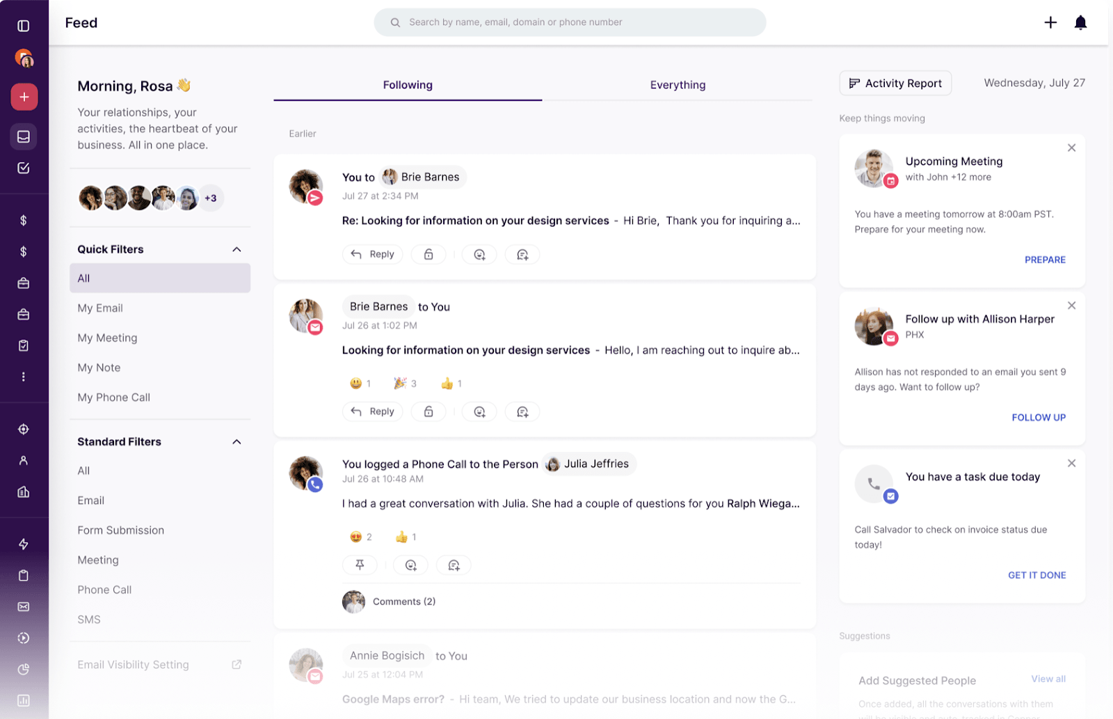 - Deep Gmail and Google Calendar integration with in-inbox CRM updates