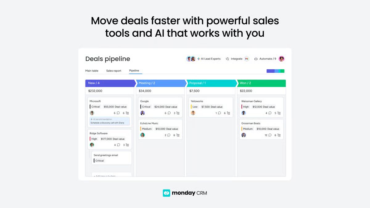 monday CRM organizes sales activity through boards, pipelines, and automation rules that teams customize to match their process. Visual workflows and code-free automations make it possible to manage outreach, deal stages, and reporting from a single workspace.