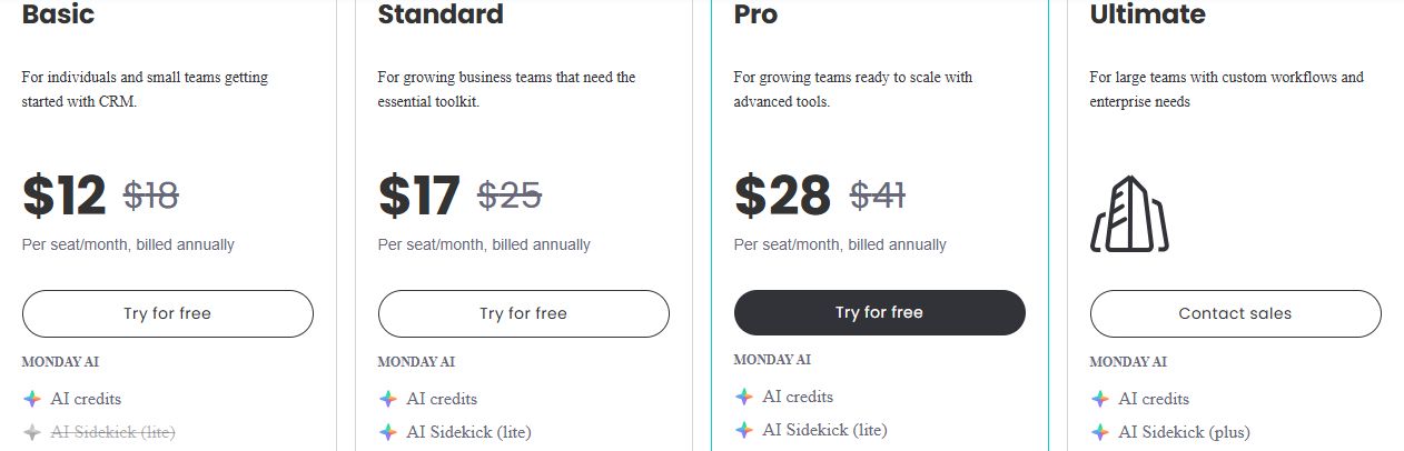 Basic | $12/user/month | Unlimited contacts and deals, core CRM boards, basic dashboards, 5GB file storage — no automations or integrations |