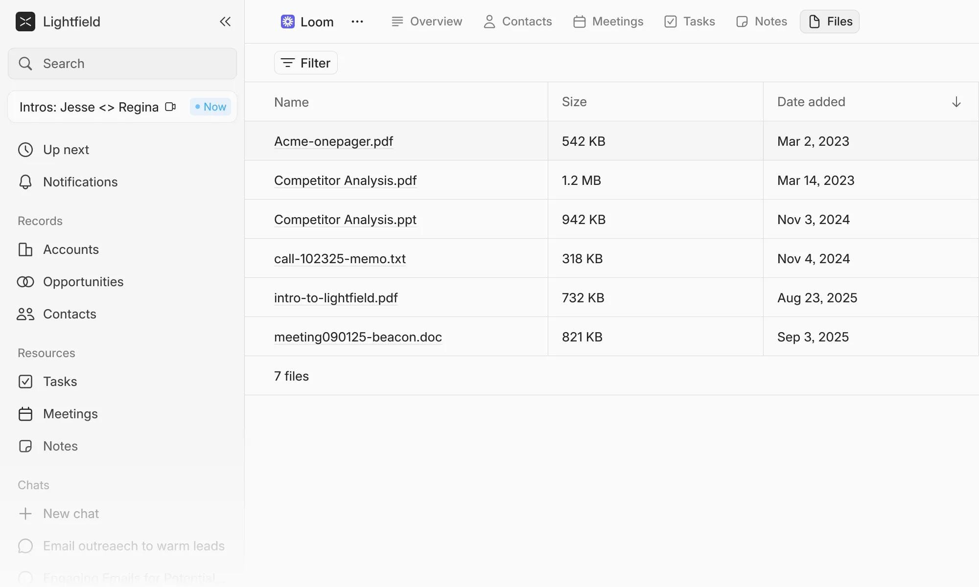 You can now upload any file to an account or opportunity record page, enabling Lightfield to cite it as related context. This works well with proposals, contracts, or other documents containing relevant company or deal content.
