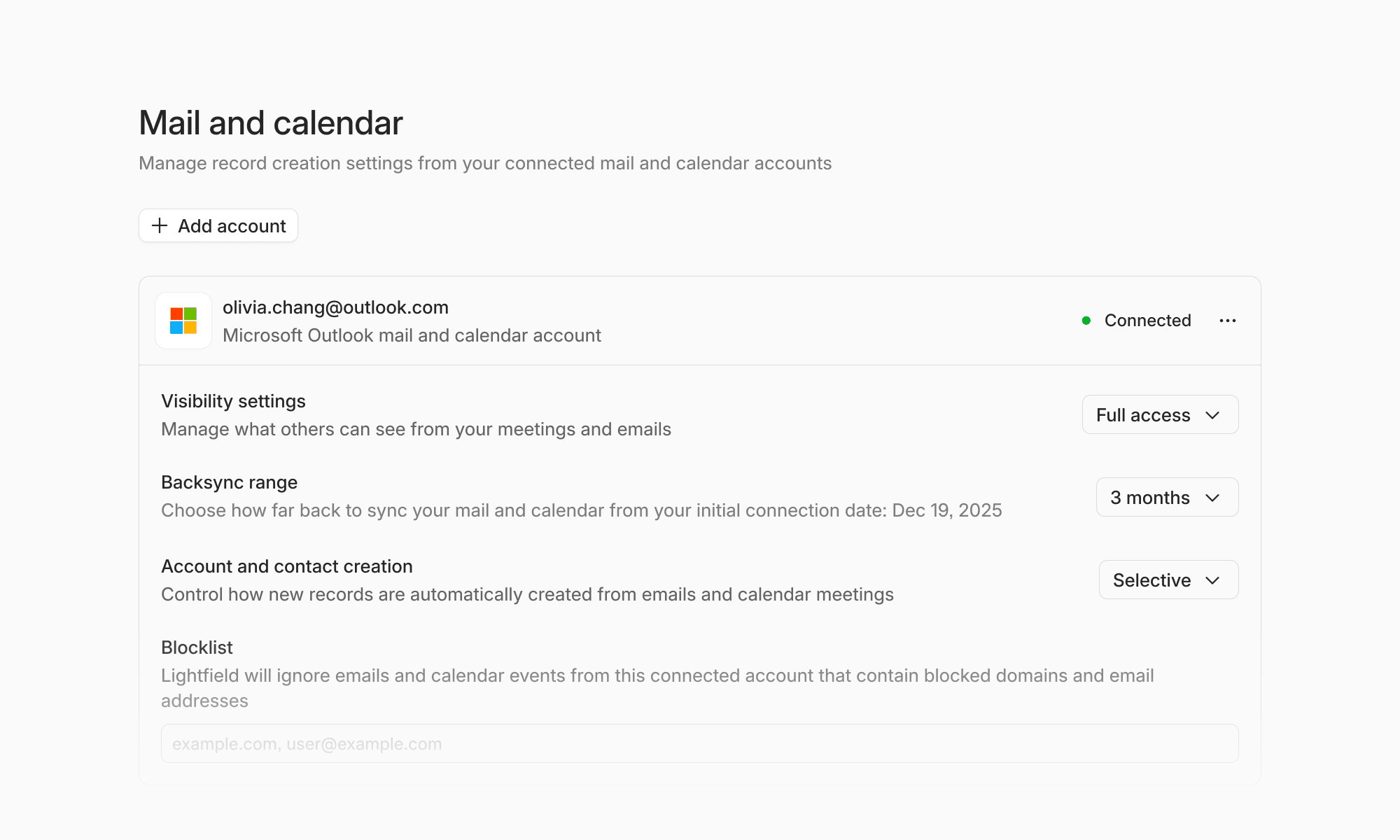 Emails and meetings from Outlook now sync with Lightfield to automatically capture emails and meetings, create and update records from interactions, and backfill historical context. If something doesn’t sync the way you expect, send us a note - we’re actively iterating based on early feedback and would love to hear from you.