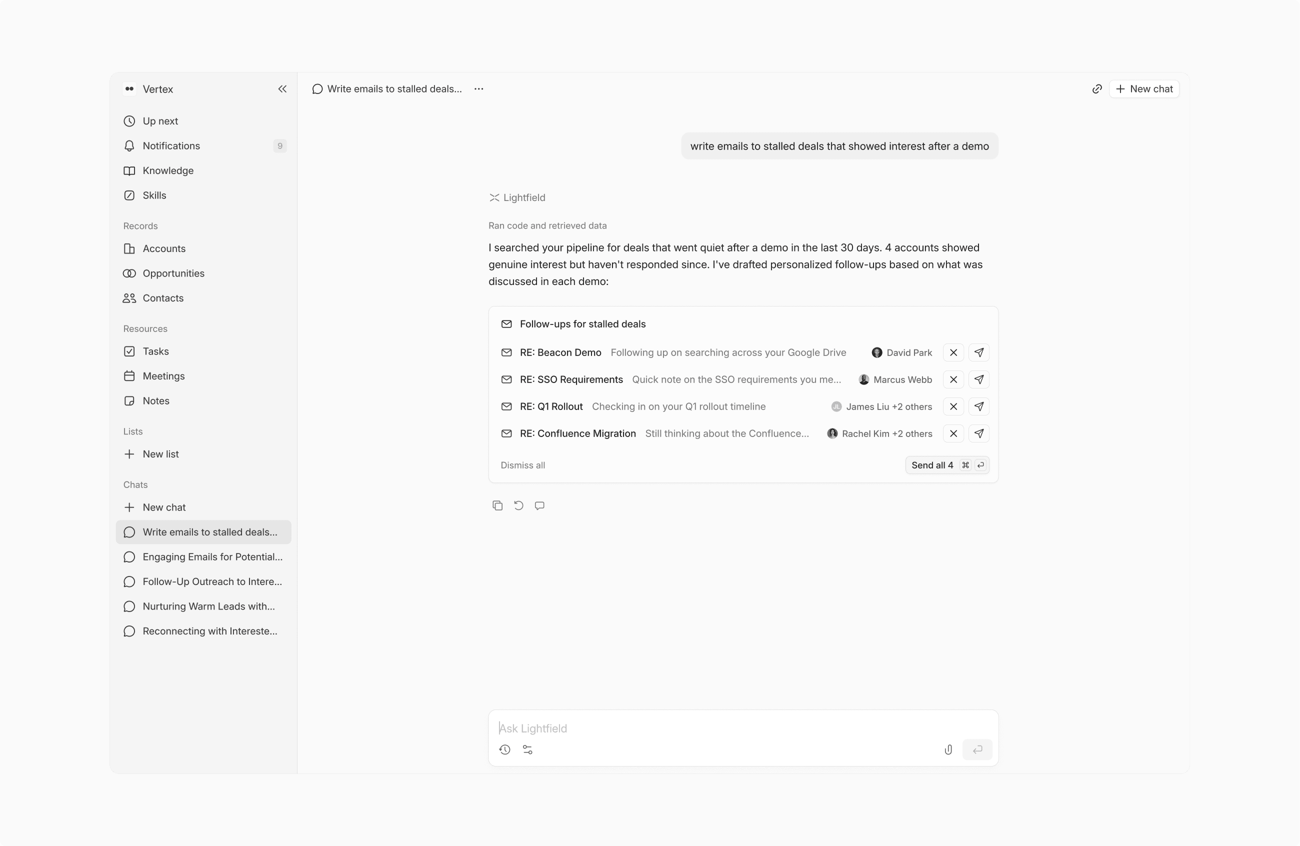 - Lightfield tracks every commitment from calls and emails, then drafts follow-ups at the right time. Deals stay warm. Your task list stays empty.