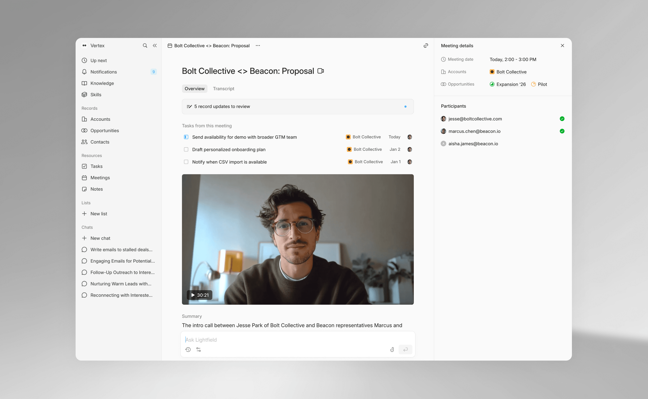 Lightfield records every external meeting with a built-in recorder. Transcripts are searchable and linked to the account, without copy-pasting between apps.